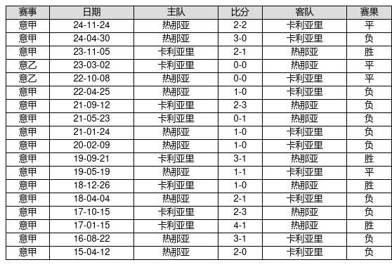 卡利亚里 VS 热那亚两队近10年的交战次数为18场,卡利亚里4胜4平10负,赢球概率为22.2%,平局概率为22.2%,输球概率为55.6%。