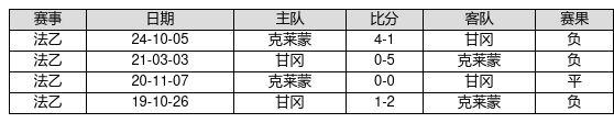 甘冈 VS 克莱蒙两队近10年的交战次数为4场,甘冈0胜1平3负,赢球概率为0.0%,平局概率为25.0%,输球概率为75.0%。