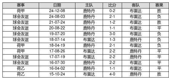 布雷达 VS 鹿特丹两队近10年的交战次数为12场,布雷达3胜5平4负,赢球概率为25.0%,平局概率为41.7%,输球概率为33.3%。
