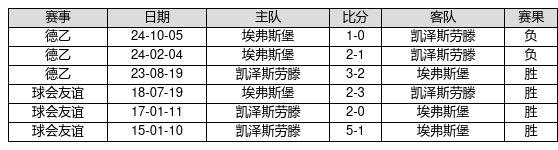 凯泽斯劳滕 VS 埃弗斯堡两队近10年的交战次数为6场,凯泽斯劳滕4胜0平2负,赢球概率为66.7%,平局概率为0.0%,输球概率为33.3%。