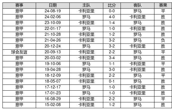 罗马 VS 卡利亚里两队近10年的交战次数为17场,罗马11胜5平1负,赢球概率为64.7%,平局概率为29.4%,输球概率为5.9%。