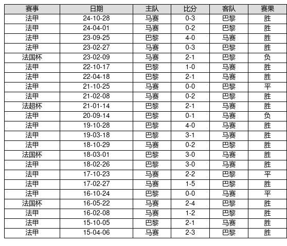 巴黎 VS 马赛两队近10年的交战次数为23场,巴黎18胜3平2负,赢球概率为78.3%,平局概率为13.0%,输球概率为8.7%。