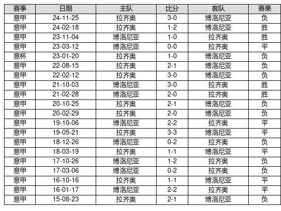 博洛尼亚 VS 拉齐奥两队近10年的交战次数为20场,博洛尼亚4胜6平10负,赢球概率为20.0%,平局概率为30.0%,输球概率为50.0%。