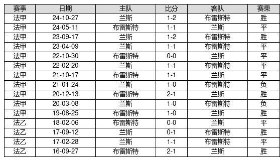 布雷斯特 VS 兰斯两队近10年的交战次数为15场,布雷斯特6胜7平2负,赢球概率为40.0%,平局概率为46.7%,输球概率为13.3%。