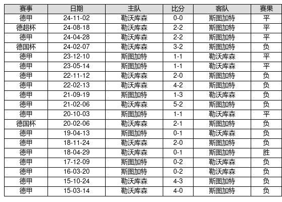 斯图加特 VS 勒沃库森两队近10年的交战次数为19场,斯图加特1胜6平12负,赢球概率为5.3%,平局概率为31.6%,输球概率为63.2%。