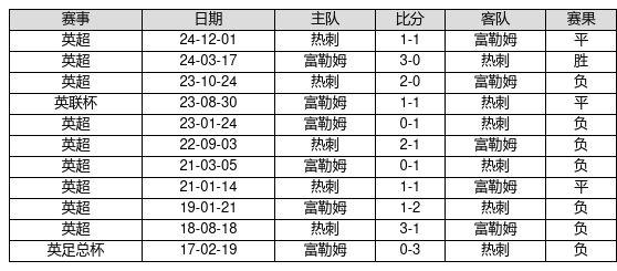 富勒姆 VS 热刺两队近10年的交战次数为11场,富勒姆1胜3平7负,赢球概率为9.1%,平局概率为27.3%,输球概率为63.6%。
