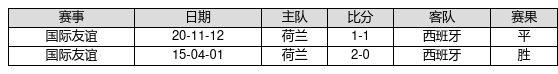 荷兰 VS 西班牙两队近10年的交战次数为2场,荷兰1胜1平0负,赢球概率为50.0%,平局概率为50.0%,输球概率为0.0%。