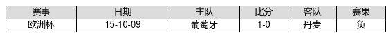 丹麦 VS 葡萄牙两队近10年的交战次数为1场,丹麦0胜0平1负,赢球概率为0.0%,平局概率为0.0%,输球概率为100.0%。