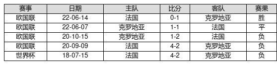 克罗地亚 VS 法国两队近10年的交战次数为5场,克罗地亚1胜1平3负,赢球概率为20.0%,平局概率为20.0%,输球概率为60.0%。