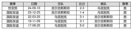 乌兹别克 VS 吉尔吉斯斯坦两队近10年的交战次数为5场,乌兹别克5胜0平0负,赢球概率为100.0%,平局概率为0.0%,输球概率为0.0%。