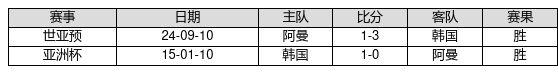 韩国 VS 阿曼两队近10年的交战次数为2场,韩国2胜0平0负,赢球概率为100.0%,平局概率为0.0%,输球概率为0.0%。