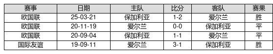 爱尔兰 VS 保加利亚两队近10年的交战次数为4场,爱尔兰2胜2平0负,赢球概率为50.0%,平局概率为50.0%,输球概率为0.0%。