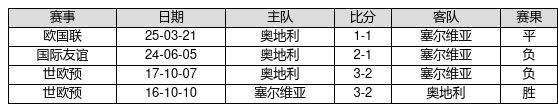 塞尔维亚 VS 奥地利两队近10年的交战次数为4场,塞尔维亚1胜1平2负,赢球概率为25.0%,平局概率为25.0%,输球概率为50.0%。