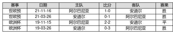 阿尔巴尼亚 VS 安道尔两队近10年的交战次数为4场,阿尔巴尼亚3胜1平0负,赢球概率为75.0%,平局概率为25.0%,输球概率为0.0%。