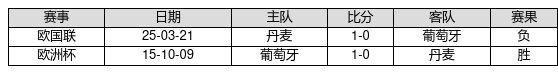 葡萄牙 VS 丹麦两队近10年的交战次数为2场,葡萄牙1胜0平1负,赢球概率为50.0%,平局概率为0.0%,输球概率为50.0%。