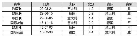 德国 VS 意大利两队近10年的交战次数为6场,德国3胜3平0负,赢球概率为50.0%,平局概率为50.0%,输球概率为0.0%。