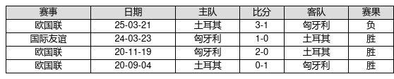 匈牙利 VS 土耳其两队近10年的交战次数为4场,匈牙利3胜0平1负,赢球概率为75.0%,平局概率为0.0%,输球概率为25.0%。