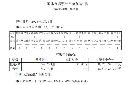 任九开奖北京时间3月23日,足彩第25044期任九开奖结果揭晓。本期任九开出247,724注,单注奖金35元。本期任九投注总额为13,817,806元。