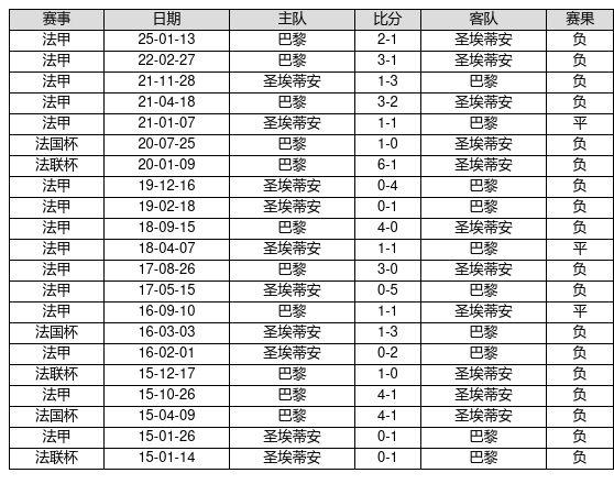 圣埃蒂安 VS 巴黎两队近10年的交战次数为21场,圣埃蒂安0胜3平18负,赢球概率为0.0%,平局概率为14.3%,输球概率为85.7%。