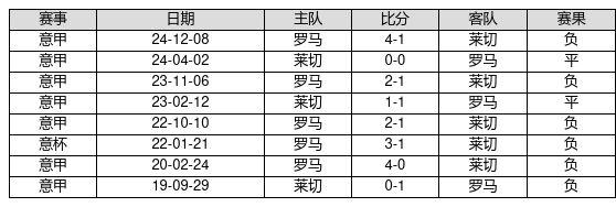 莱切 VS 罗马两队近10年的交战次数为8场,莱切0胜2平6负,赢球概率为0.0%,平局概率为25.0%,输球概率为75.0%。