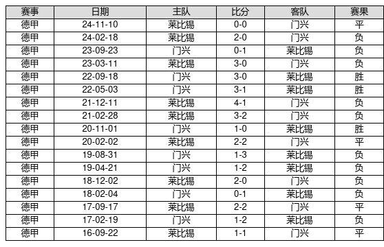 门兴 VS 莱比锡两队近10年的交战次数为17场,门兴3胜4平10负,赢球概率为17.6%,平局概率为23.5%,输球概率为58.8%。