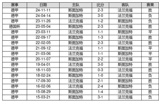 法兰克福 VS 斯图加特两队近10年的交战次数为17场,法兰克福8胜4平5负,赢球概率为47.1%,平局概率为23.5%,输球概率为29.4%。