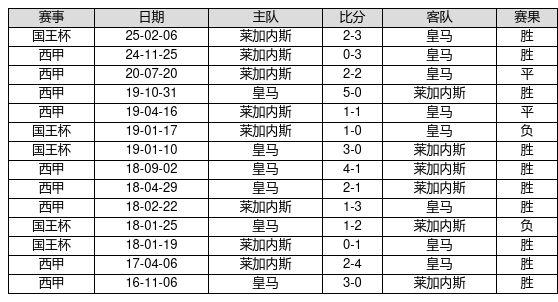 皇马 VS 莱加内斯两队近10年的交战次数为14场,皇马10胜2平2负,赢球概率为71.4%,平局概率为14.3%,输球概率为14.3%。