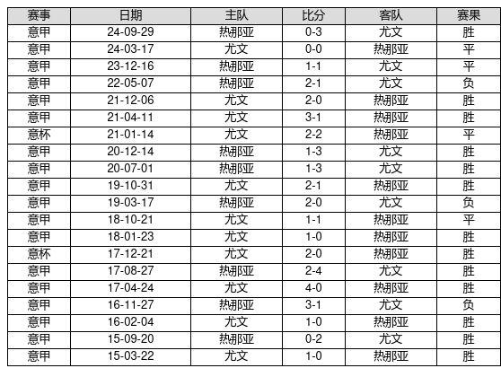 尤文 VS 热那亚两队近10年的交战次数为20场,尤文13胜4平3负,赢球概率为65.0%,平局概率为20.0%,输球概率为15.0%。