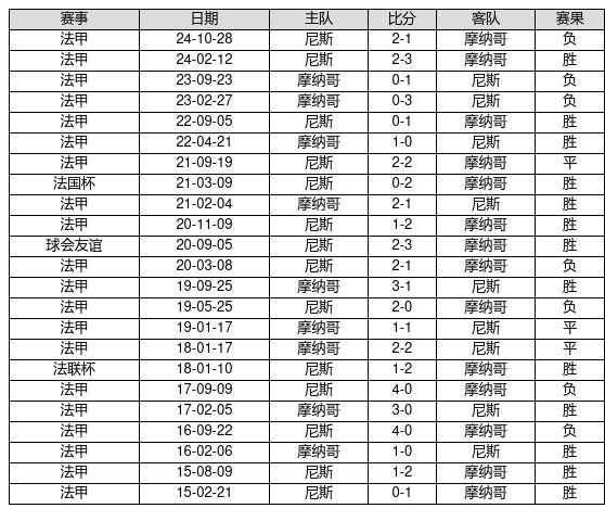摩纳哥 VS 尼斯两队近10年的交战次数为23场,摩纳哥13胜3平7负,赢球概率为56.5%,平局概率为13.0%,输球概率为30.4%。