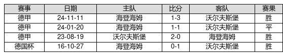 沃尔夫斯堡 VS 海登海姆两队近10年的交战次数为4场,沃尔夫斯堡3胜1平0负,赢球概率为75.0%,平局概率为25.0%,输球概率为0.0%。