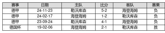 海登海姆 VS 勒沃库森两队近10年的交战次数为4场,海登海姆1胜0平3负,赢球概率为25.0%,平局概率为0.0%,输球概率为75.0%。