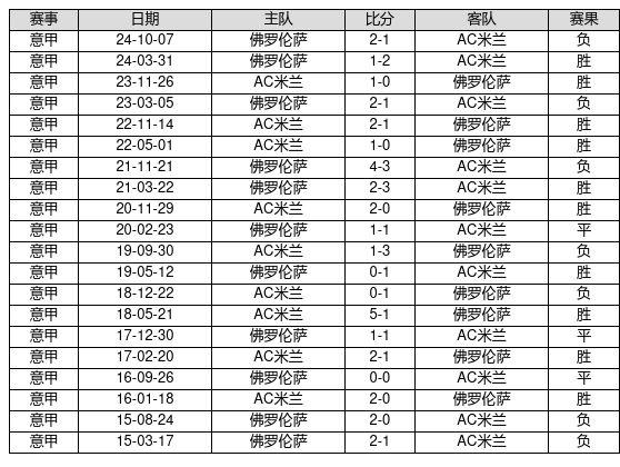 AC米兰 VS 佛罗伦萨两队近10年的交战次数为20场,AC米兰10胜3平7负,赢球概率为50.0%,平局概率为15.0%,输球概率为35.0%。
