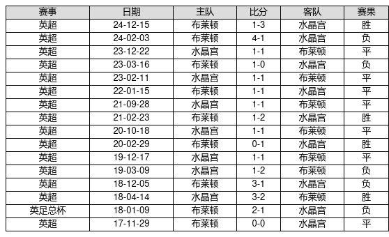 水晶宫 VS 布莱顿两队近10年的交战次数为16场,水晶宫4胜7平5负,赢球概率为25.0%,平局概率为43.8%,输球概率为31.2%。