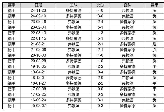 弗赖堡 VS 多特蒙德两队近10年的交战次数为18场,弗赖堡2胜3平13负,赢球概率为11.1%,平局概率为16.7%,输球概率为72.2%。