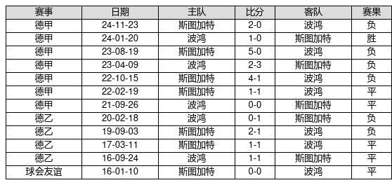 波鸿 VS 斯图加特两队近10年的交战次数为12场,波鸿1胜5平6负,赢球概率为8.3%,平局概率为41.7%,输球概率为50.0%。
