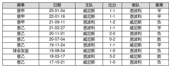 恩波利 VS 威尼斯两队近10年的交战次数为10场,恩波利2胜4平4负,赢球概率为20.0%,平局概率为40.0%,输球概率为40.0%。