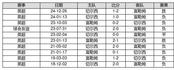 富勒姆 VS 切尔西两队近10年的交战次数为10场,富勒姆2胜1平7负,赢球概率为20.0%,平局概率为10.0%,输球概率为70.0%。