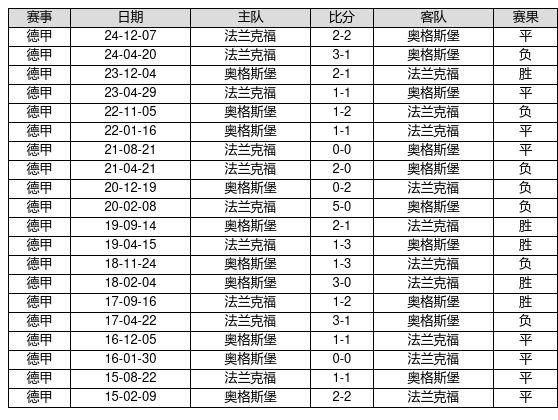奥格斯堡 VS 法兰克福两队近10年的交战次数为20场,奥格斯堡5胜8平7负,赢球概率为25.0%,平局概率为40.0%,输球概率为35.0%。