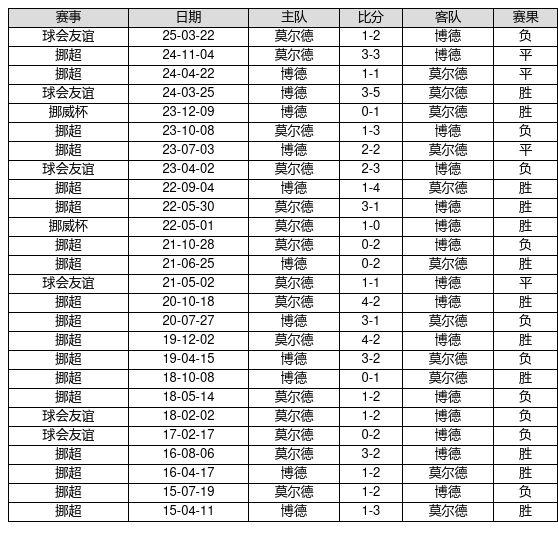 莫尔德 VS 博德两队近10年的交战次数为26场,莫尔德12胜4平10负,赢球概率为46.2%,平局概率为15.4%,输球概率为38.5%。