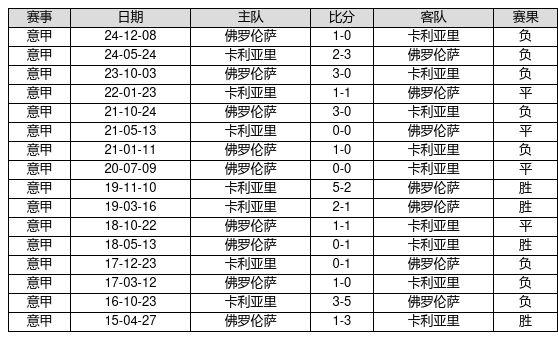 卡利亚里 VS 佛罗伦萨两队近10年的交战次数为16场,卡利亚里4胜4平8负,赢球概率为25.0%,平局概率为25.0%,输球概率为50.0%。