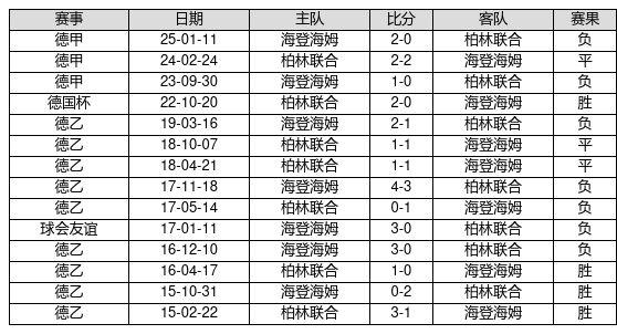 柏林联合 VS 海登海姆两队近10年的交战次数为14场,柏林联合4胜3平7负,赢球概率为28.6%,平局概率为21.4%,输球概率为50.0%。