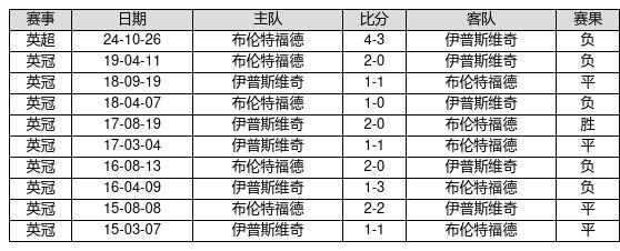 伊普斯维奇 VS 布伦特福德两队近10年的交战次数为10场,伊普斯维奇1胜4平5负,赢球概率为10.0%,平局概率为40.0%,输球概率为50.0%。