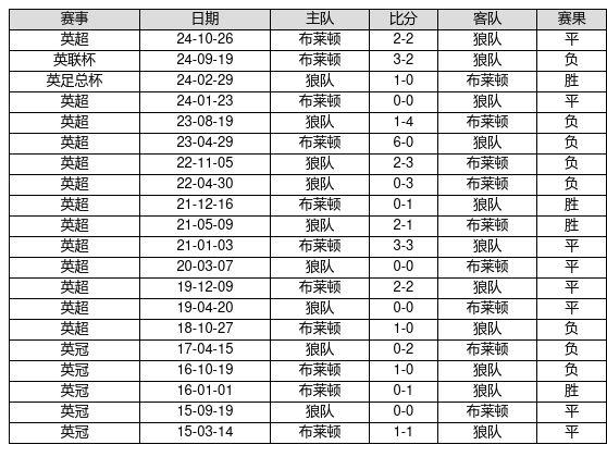 狼队 VS 布莱顿两队近10年的交战次数为20场,狼队4胜8平8负,赢球概率为20.0%,平局概率为40.0%,输球概率为40.0%。