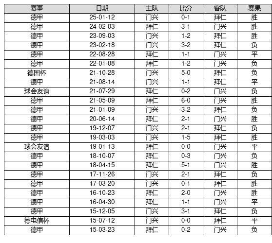 拜仁 VS 门兴两队近10年的交战次数为24场,拜仁9胜5平10负,赢球概率为37.5%,平局概率为20.8%,输球概率为41.7%。