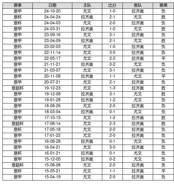 拉齐奥 VS 尤文两队近10年的交战次数为29场,拉齐奥7胜3平19负,赢球概率为24.1%,平局概率为10.3%,输球概率为65.5%。