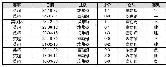 富勒姆 VS 埃弗顿两队近10年的交战次数为10场,富勒姆4胜4平2负,赢球概率为40.0%,平局概率为40.0%,输球概率为20.0%。