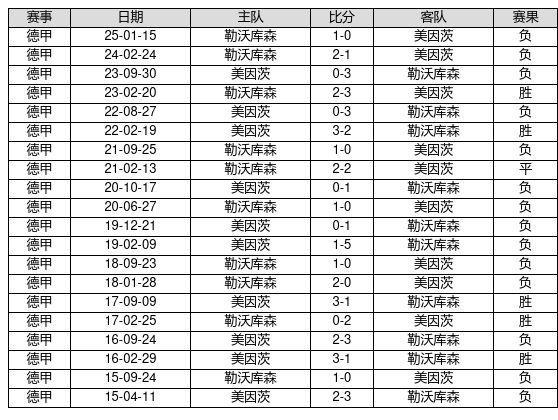 美因茨 VS 勒沃库森两队近10年的交战次数为20场,美因茨5胜1平14负,赢球概率为25.0%,平局概率为5.0%,输球概率为70.0%。