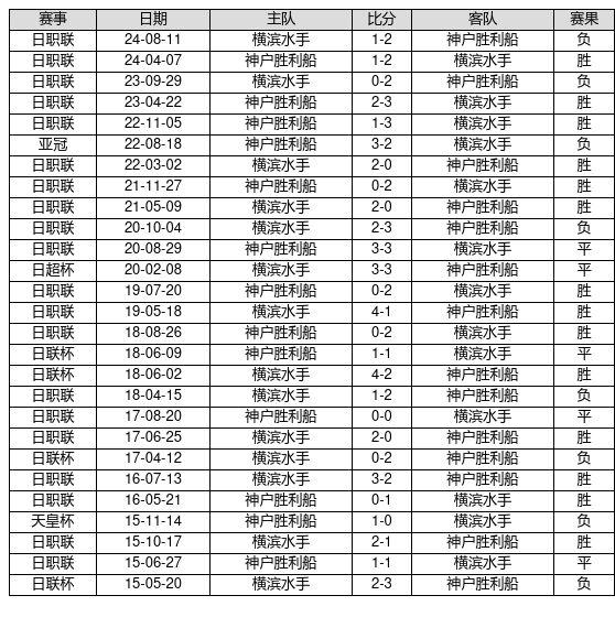 横滨水手 VS 神户胜利船两队近10年的交战次数为27场,横滨水手14胜5平8负,赢球概率为51.9%,平局概率为18.5%,输球概率为29.6%。