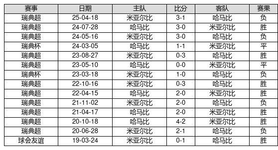 哈马比 VS 米亚尔比两队近10年的交战次数为14场,哈马比7胜2平5负,赢球概率为50.0%,平局概率为14.3%,输球概率为35.7%。