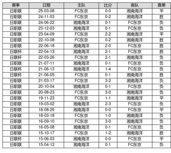 湘南海洋 VS FC东京两队近10年的交战次数为24场,湘南海洋6胜5平13负,赢球概率为25.0%,平局概率为20.8%,输球概率为54.2%。